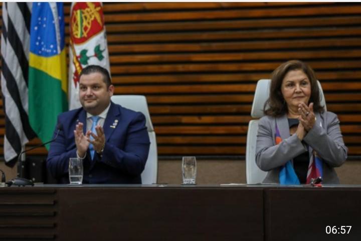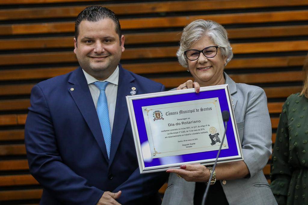 O Vereador Augusto Duarte, em nome dos parlamentares, agradeceu os serviços prestados na cidade de Santos pelos Rotarianos e entregou Placa comemorativa a Governadora do Distrito 4420 de Rotary Internacional Alaíde Vitorino. A Sessão solene foi presidida pela Vereadora Audrey Kleys e representando o Prefeito Municipal , a Vice Prefeita Renata Bravo .
