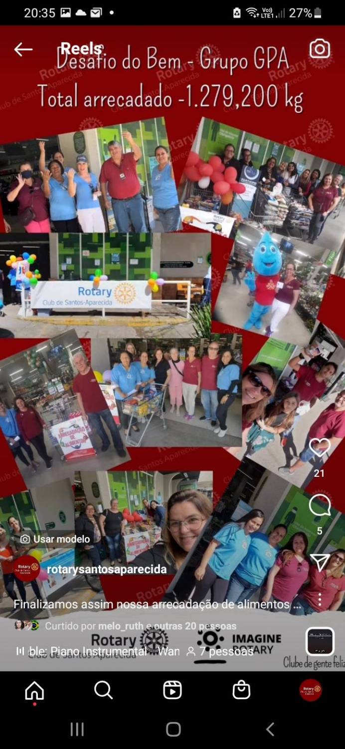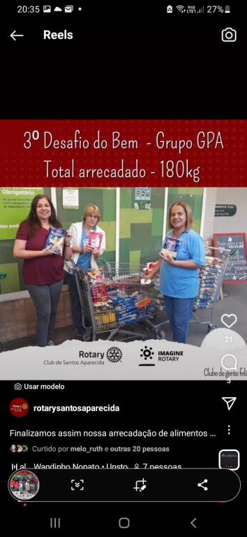 Em 03 meses de arrecadação de alimentos na Loja Pão de Açucar participando da Campanha "DESAFIO DO BEM" parceria com o Grupo IGPA os associados do Rotary Club de Santos Aparecida arrecadaram cerca de 1.300 kg de alimentos que foram doados para as entidades : Creche Irmã Scheilla - Creche Estrela Guia e Creche N.S. DIvina Providência , todas na Cidadede Santos que participaram ativamente na abordagem aos clientes. As Doações dos Alimentos auxiliam as creches no complemento alimentar de cerca de 500 crianças .