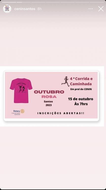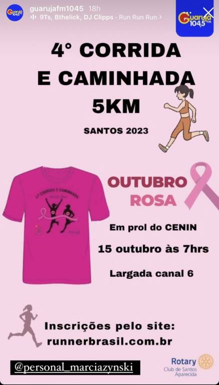 "Participe da emocionante corrida do *Rotary Clube de Santos Aparecida* , faça sua inscrição pelo site da Runner Brasil! Junte-se a nós para uma manhã repleta de esporte, saúde e solidariedade no dia *15 de outubro de 2023*. Venha correr por uma causa nobre e contribuir para projetos sociais que beneficiam toda a comunidade.