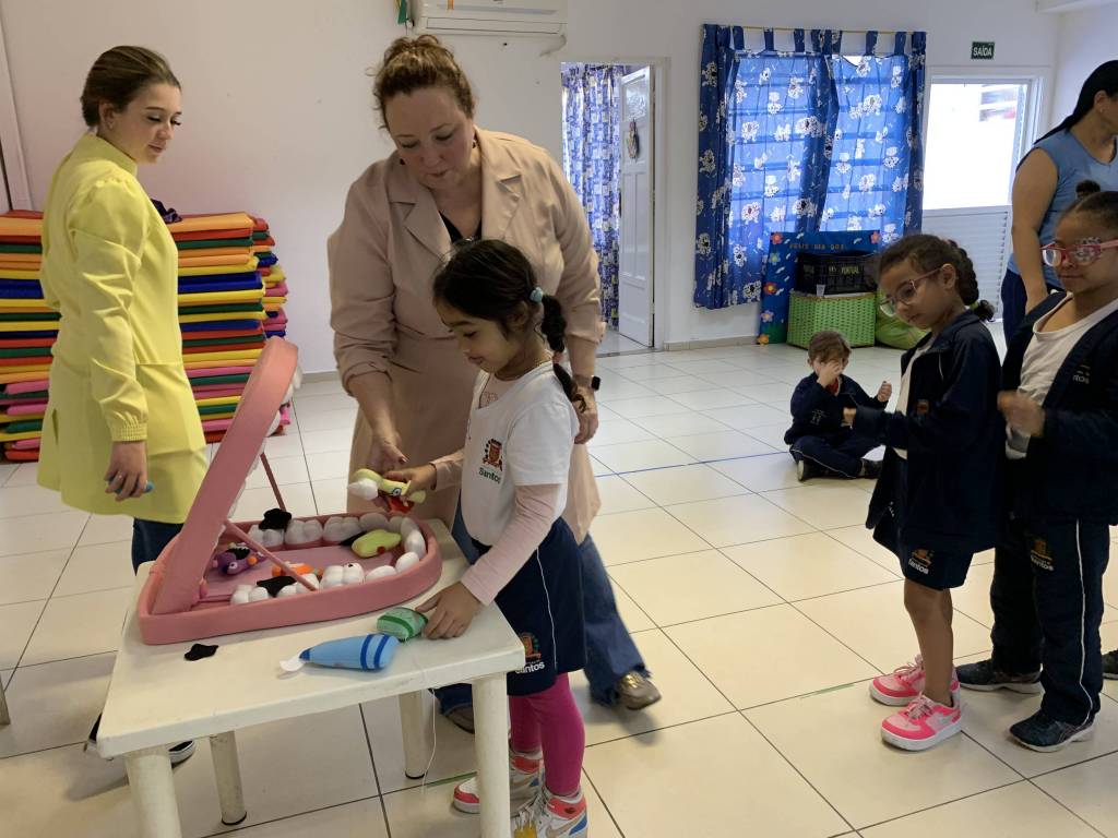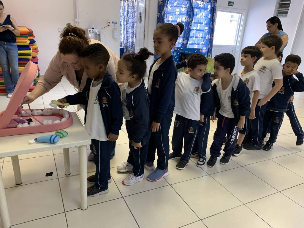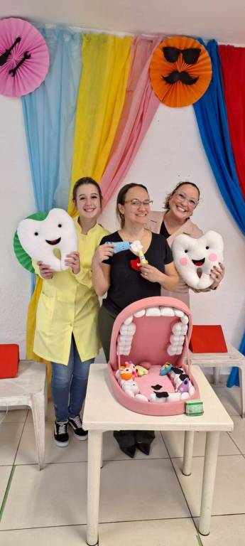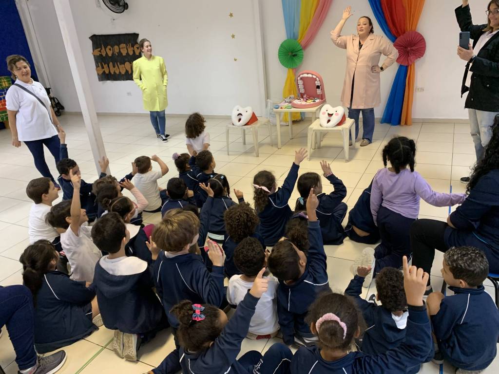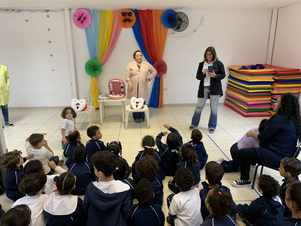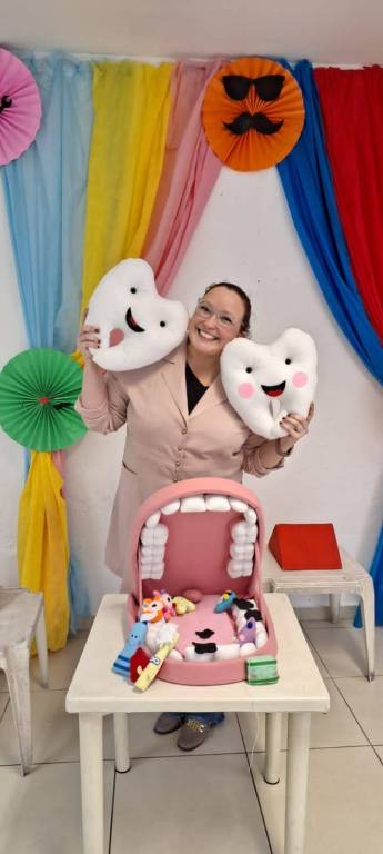 A Dra. Ana Paula Fassina, uma dentista excepcional, esteve presente para orientar nossas crianças de maneira carinhosa e atenciosa. Ela não apenas ensinou, mas também praticou e mostrou como prevenir as cáries, transmitindo conhecimento e promovendo a importância da saúde bucal.