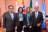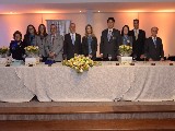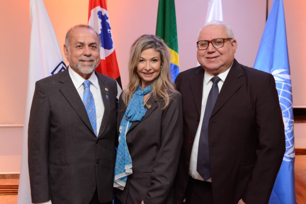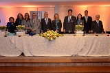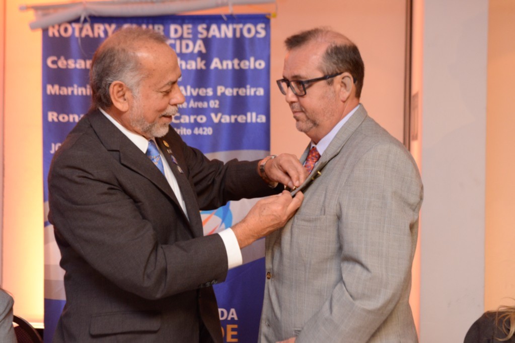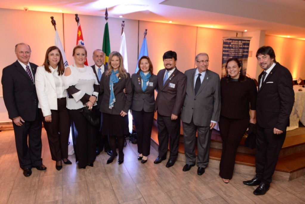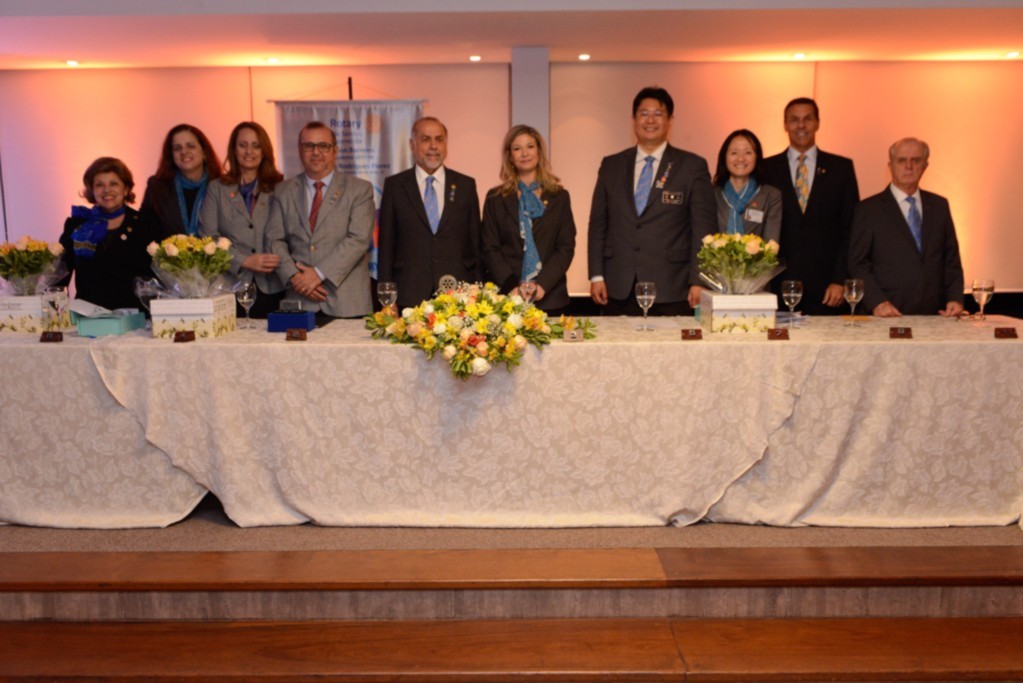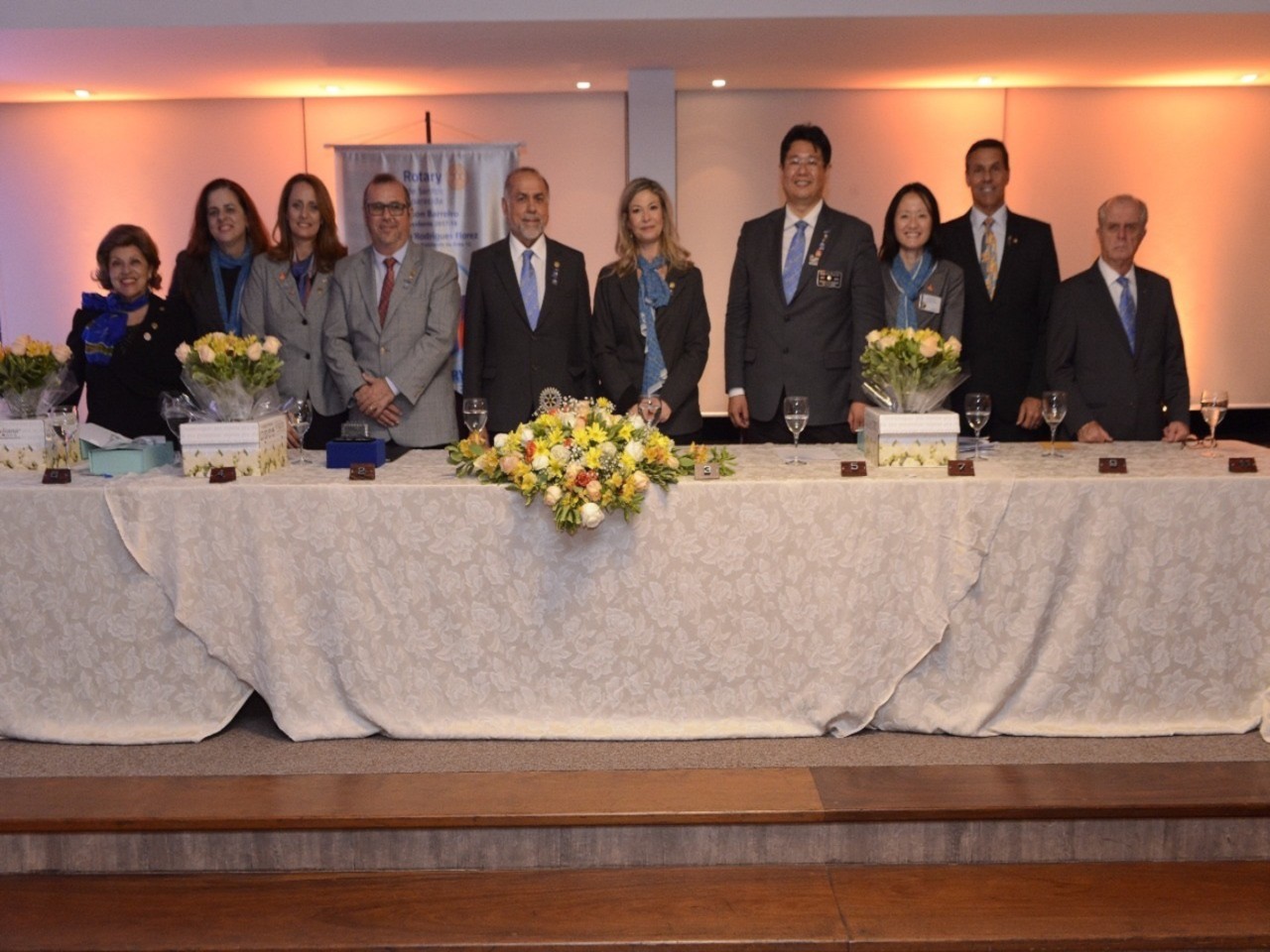 MESA - Além de César, Nilson, Takata e respectivas cônjuges, compuseram a mesa o vice-prefeito de Santos; o governador distrital (2009-2010) Roberto Luiz Barroso Filho - fundador do clube Santos-Aparecida e representante do Colégio de Governadores; a presidente do Rotary Ponta da Praia - clube padrinho do Santos-Aparecida -, Andrea Vilela Ferraz Dueñas; Leda Maria de Vasconcellos, presidente da Asfar 2017-2018; e Sérgio Lazzarini, governador distrital (2008-2009).