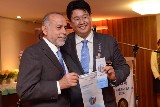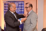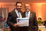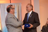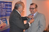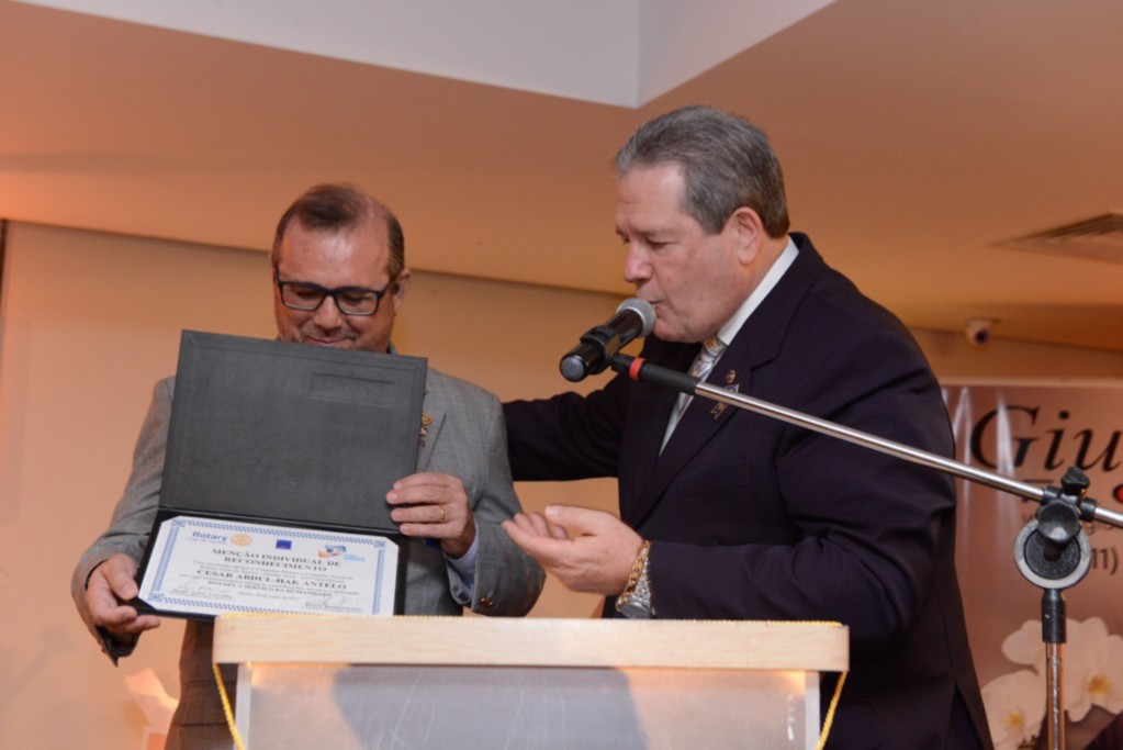 AGRADECIMENTO E HOMENAGENAGENS ? No início da cerimônia, Sérgio André Carvalho, presidente Humanitário (2016-2017) do Rotary Santos subiu à tribuna para homenagear César Abdul-Hak Antelo, entregando certificado de Menção Individual de Reconhecimento em razão de esforços, contribuições, serviços e dedicação.