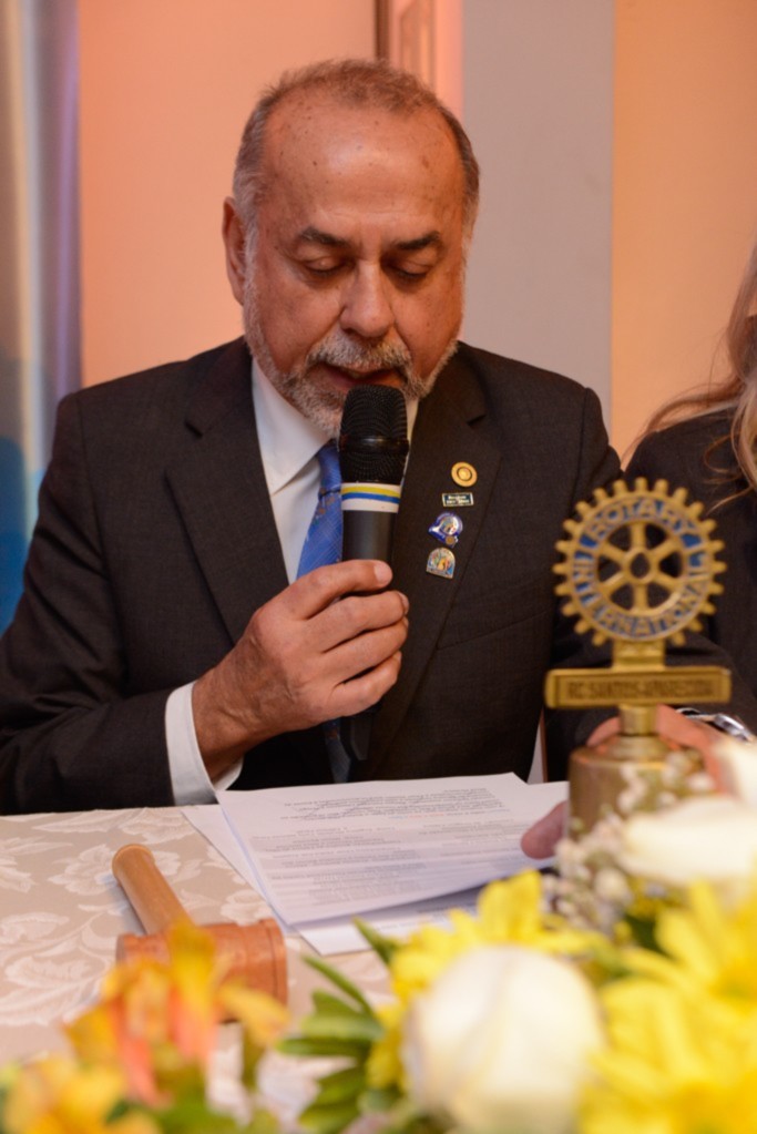 DISCURSOS - Na despedida da presidência, César Antelo destacou o bom combate que é travado em nome de nossos sonhos. Ele também mencionou o resultado da recente ação do Rotary Santos-Aparecida que arrecadou mais de uma tonelada de alimentos para a Sociedade São Vicente de Paulo. A necessidade de vencer, supera as impossibilidades. Também destacou o trabalho de Angélica Nicoletti na realização da festa. Destaco em particular a capacidade fantástica de agregar, liderar e fazer acontecer da Angélica, ao se referir à organização do evento e ao número de convidados presentes.