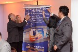 TRABALHO HUMANITÁRIO - Entre os destaques do discurso do governador Cláudio Takata, foi ressaltado o trabalho dos presidentes humanitários no serviço à comunidade. No ano passado, eles foram responsáveis por viabilizar investimentos de 500 mil dólares para compra de equipamentos e materiais para comunidades carentes de nosso distrito. O governador disse que o Distrito 4420 está incentivando o clube Santos-Aparecida a conquistar a menção do Rotary e presenteou o presidente Nilson com flâmula com o lema do distrito.