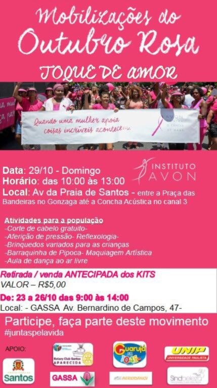 O Toque de Amor Fechando o mês do Outubro Rosa , o Rotary Club de Santos Aparecida promoveu em parceria com o Instituto Avon, uma grande mobilização de conscientização ao Câncer de Mamas.