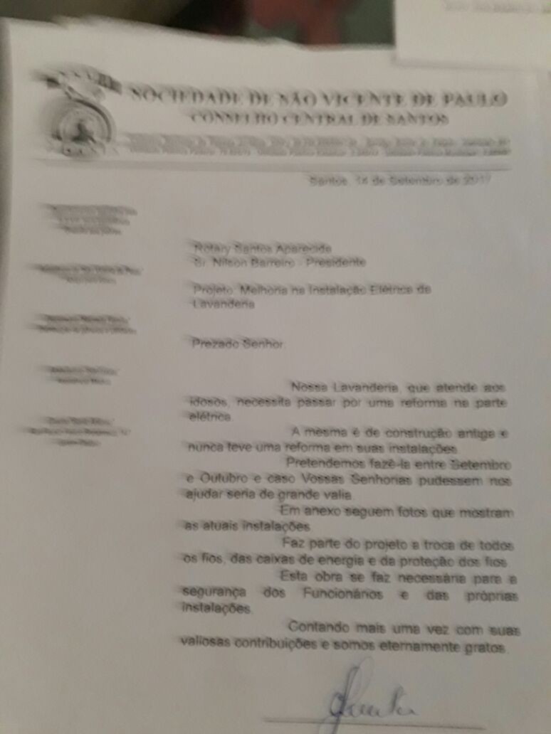 No dia 26/12/2017 foi entregue na Sociedade São Vicente de Paulo em Santos, material elétrico para troca de fiação das instalações na Lavanderia da entidade. A Doação se deu através do Subsidio Distrital concedida ao nosso Clube pela Fundação Rotária.