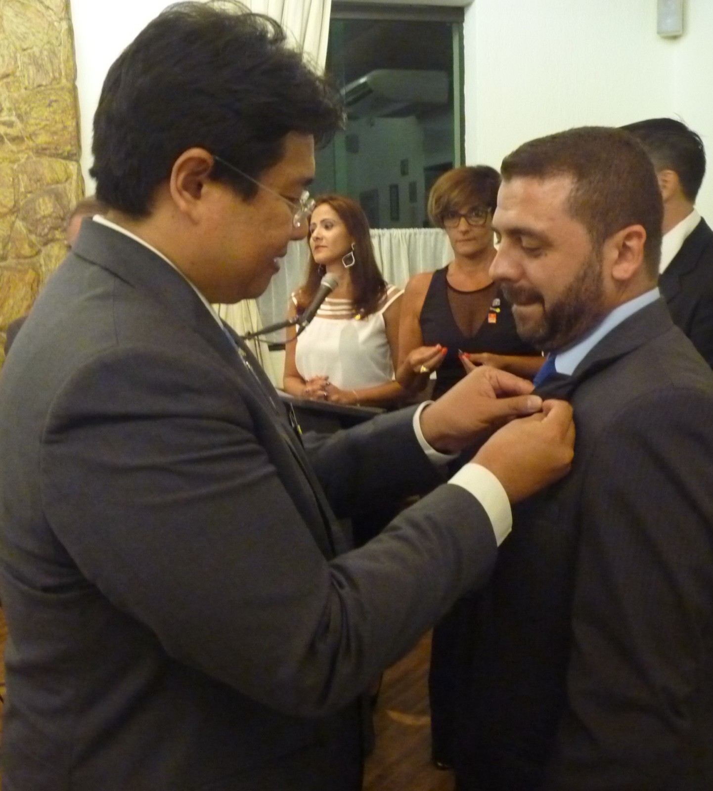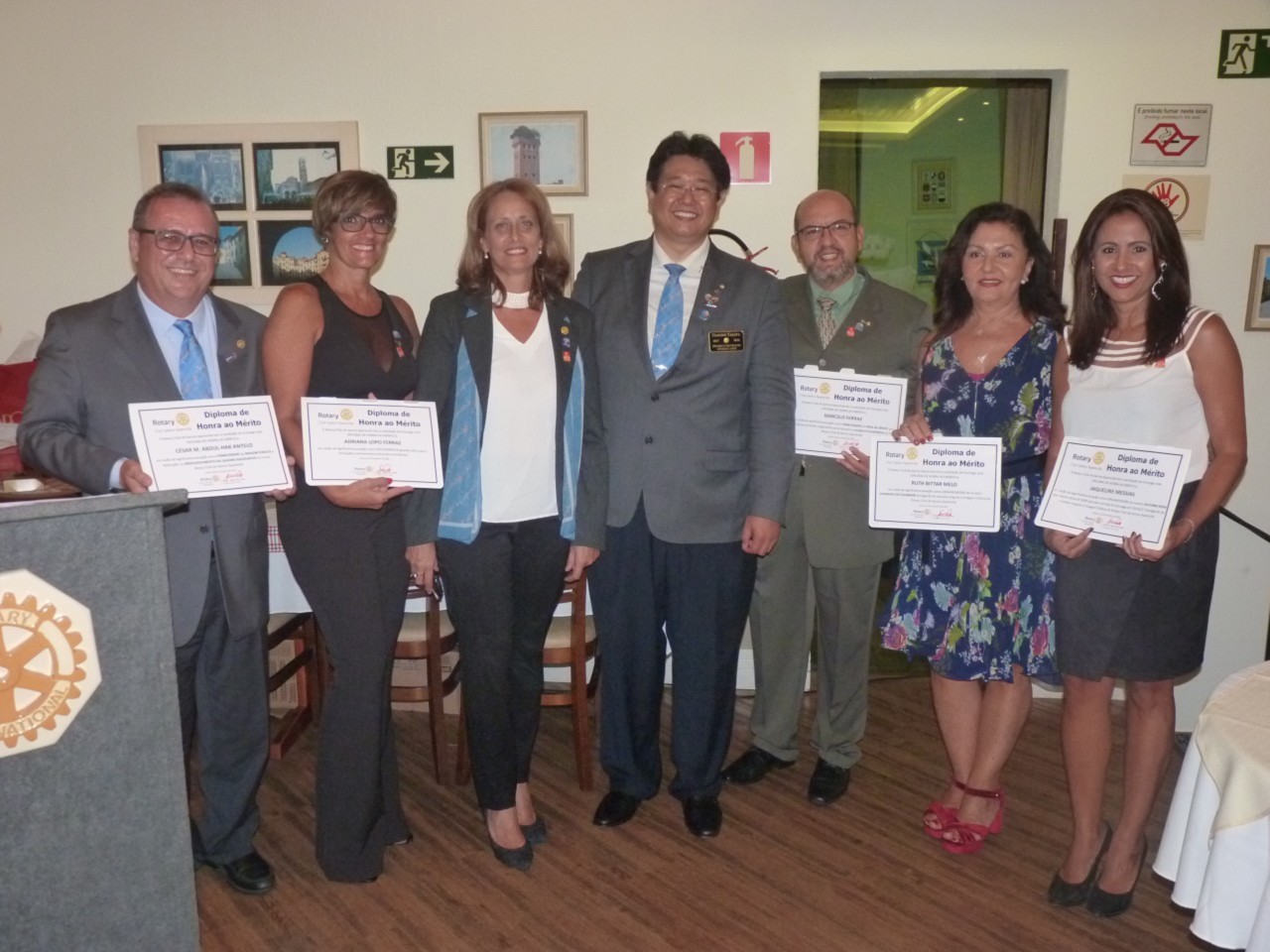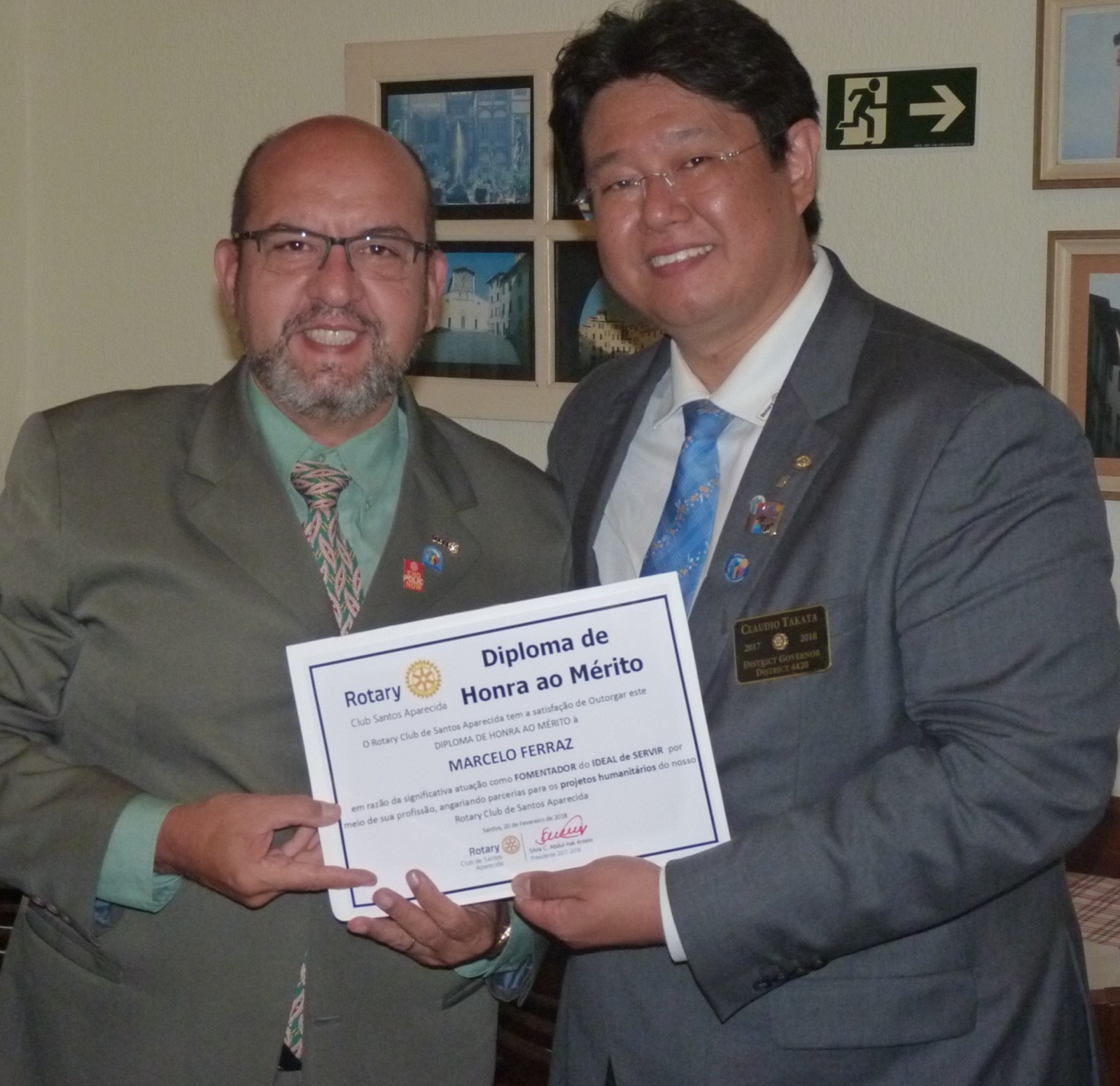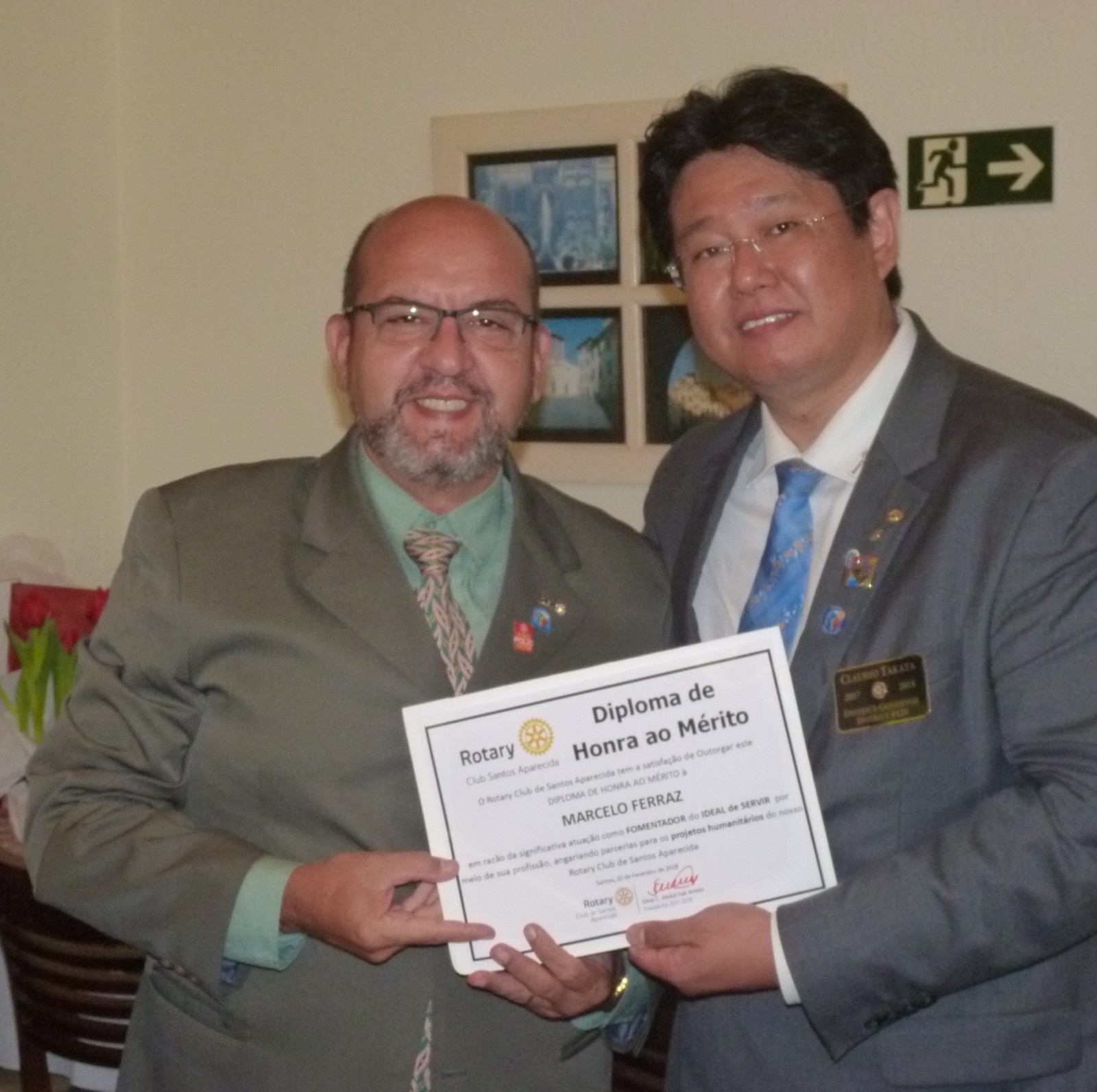 Finalizando as homenagens, o companheiro Marcelo Ferraz, também recebeu um diploma de Honra ao Mérito em forma de reconhecimento por sua atuação no ideal de servir. Por meio de sua profissão, sempre conquista novas parcerias para os projetos humanitários do clube.
