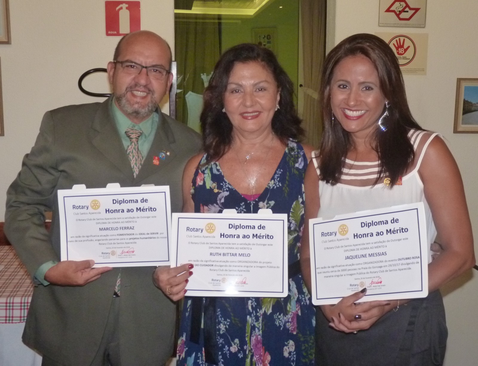A companheira Jaqueline Messias recebeu um diploma de Honra ao Mérito em forma de reconhecimento e agradecimento pela organização do evento Outubro Rosa, onde reuniu cerca de 3.000 pessoas na Praia do Gonzaga, no ano passado. Já à associada, Ruth Bittar Melo, recebeu o mesmo diploma em forma de agradecimento pela organização do projeto Cuidando do cuidador, divulgando de maneira singular a imagem pública do clube.