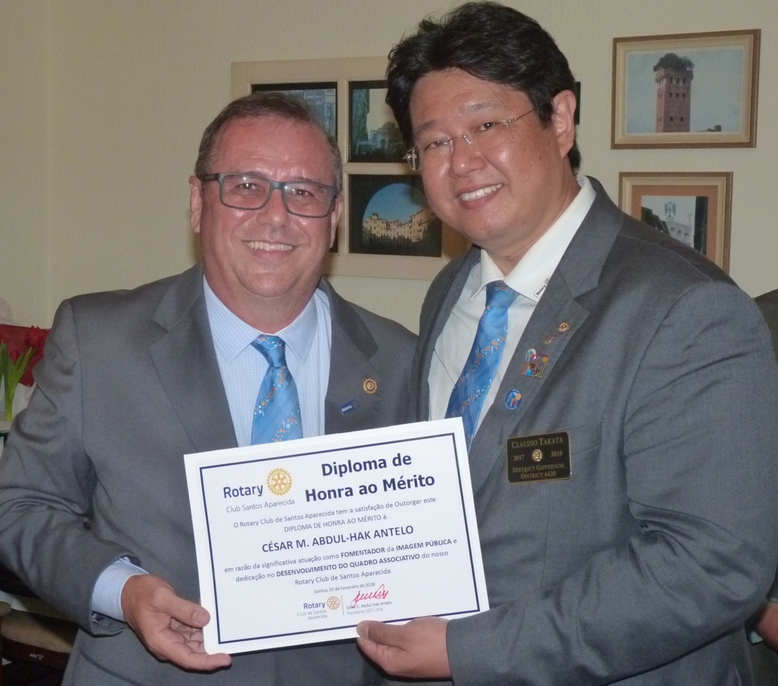 César Antelo foi homenageado pela atuação de fomentador e dedicação no desenvolvimento do quadro associativo do RC Santos Aparecida, recebeu do governador um diploma de Honra ao Mérito em forma de reconhecimento e agradecimento.