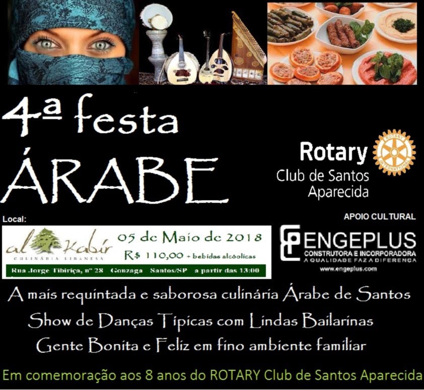 O 8º Aniversário do Rotary Club de Santos-Aparecida foi comemorado com muita alegria em Festa Àrabe no Restaurante Al Kabir em Santos .