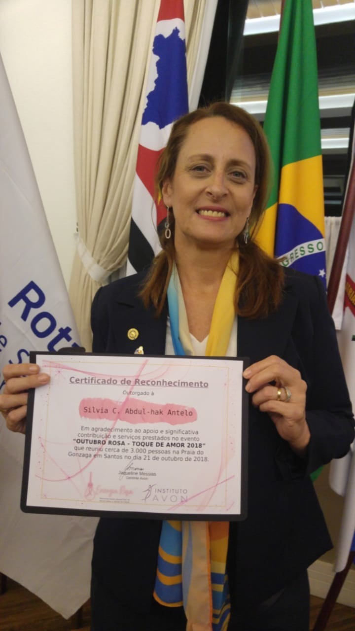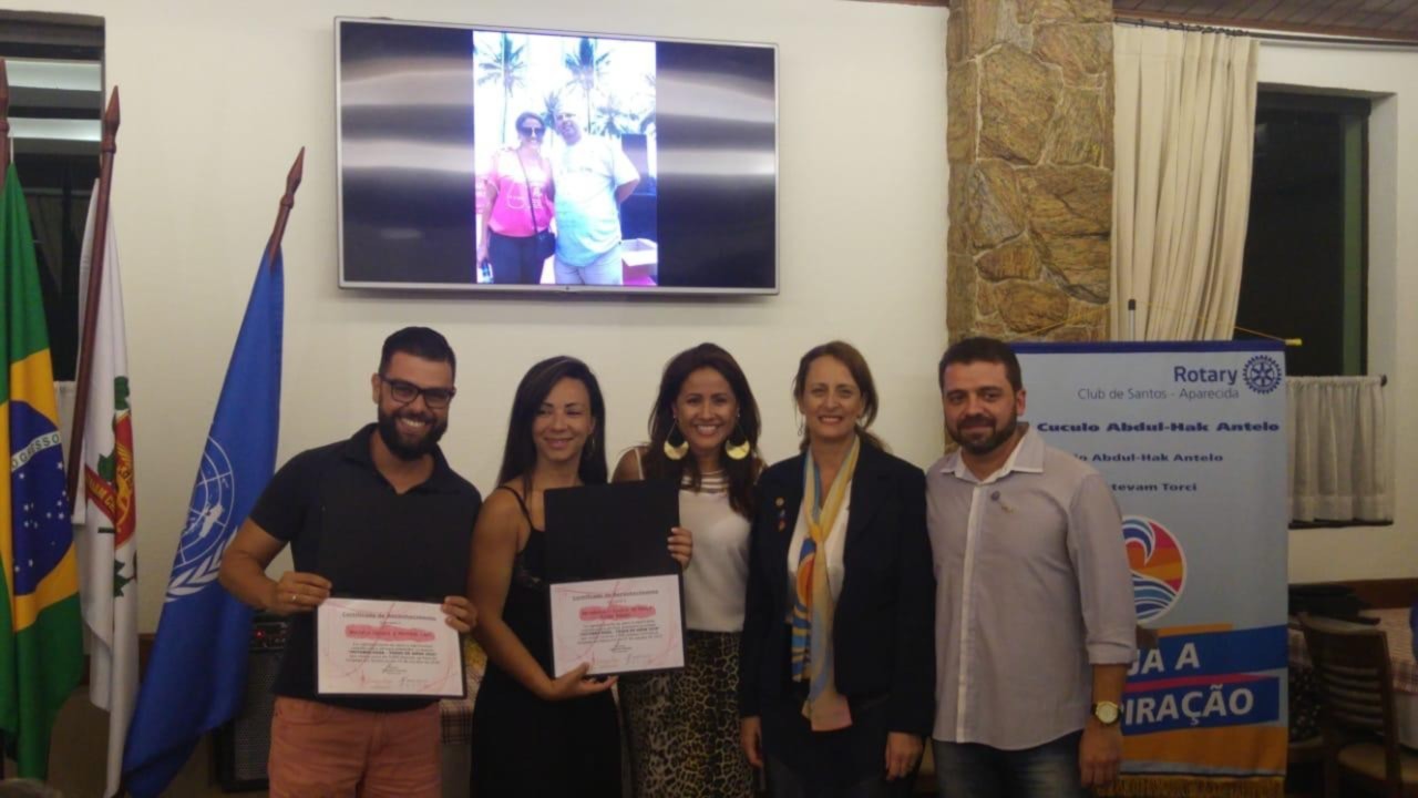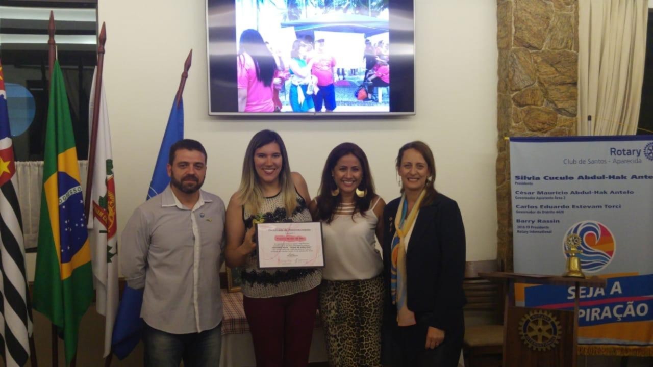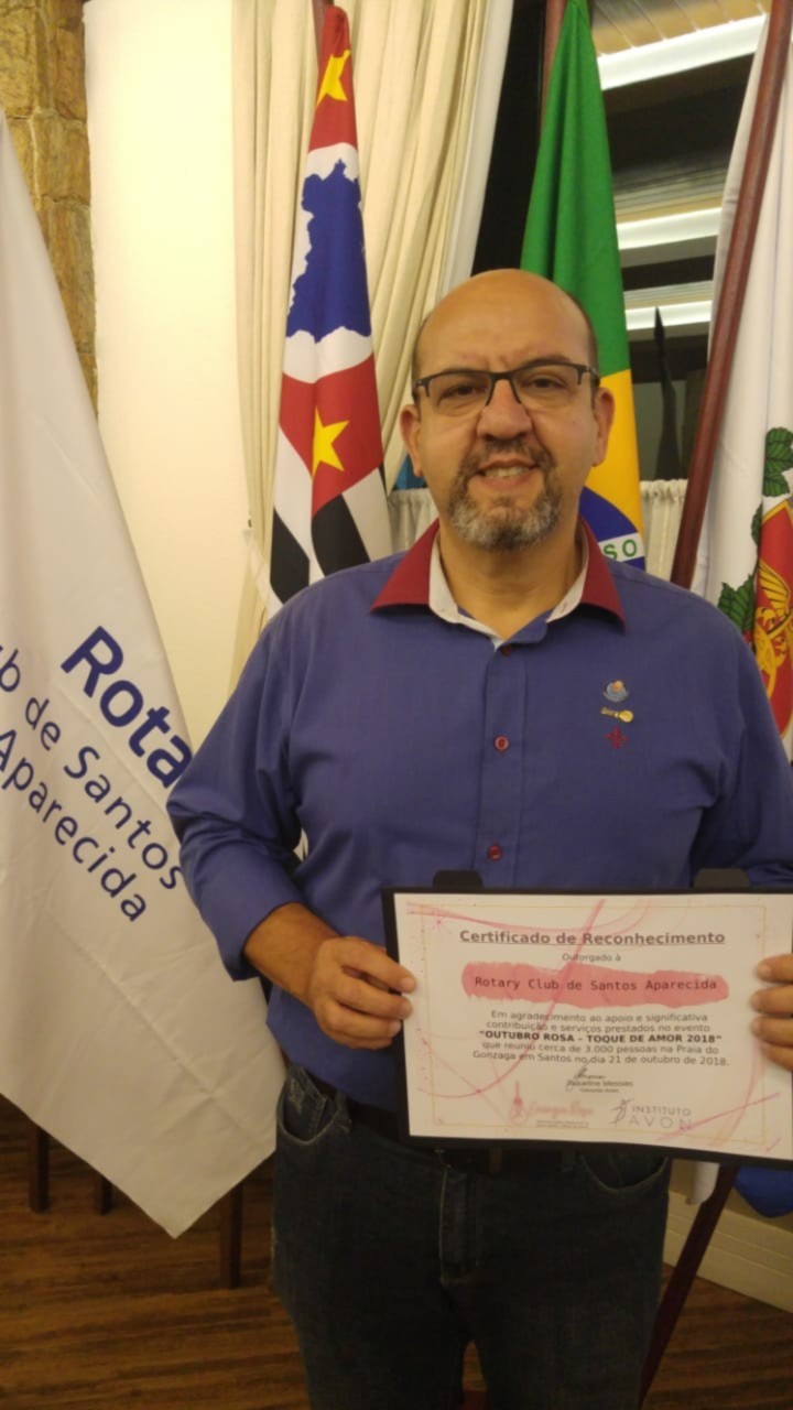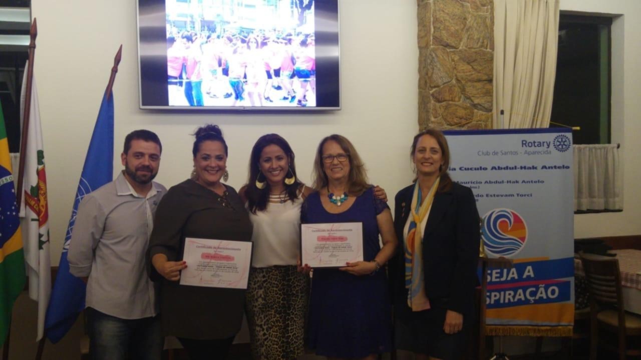O Rotary Santos Aparecida e Instituto AVon certificam parceiros e colaboradores do Evento Outubro Rosa -Toque de Amor 2018 em reunião realizada no último dia 05/12 . Foram Homenageados os Parceiros -Anseven -Som e equipamentos, Haute- Estética, Universidade Santa Cecília , Mechas de Amor, Toda Malha, AeroDança, Marathon Academia , Raphael Moreno Assessoria esportiva , Projeto Vibra Vida e Prefeitura de Santos. e ao final homenageamos os companheiros Jaqueline Messias e Thiago Tenreiro pelo empenho e realização do evento.